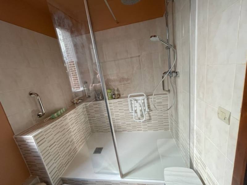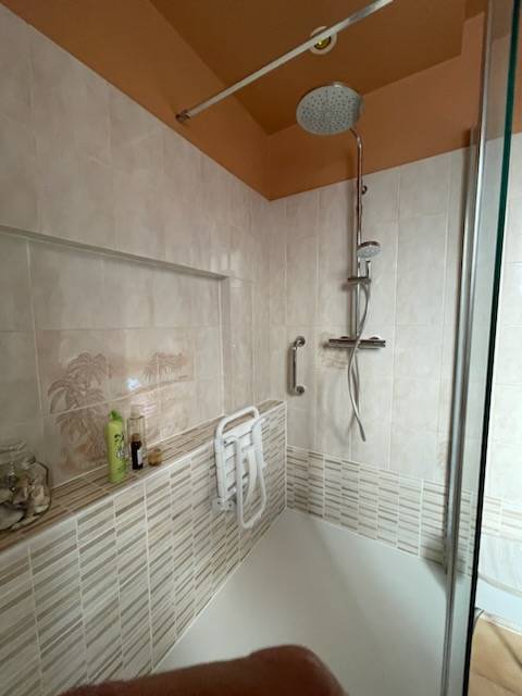 Au vue de la taille de la salle de bain, nous avons conseillé nos client sur une dimension de 160 x 60 pour leur douche. A noter qu'en plus de l'installation de la douche, nos techniciens ont également posé un siège de douche et une poignée de maintien.
